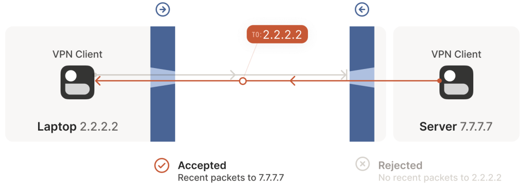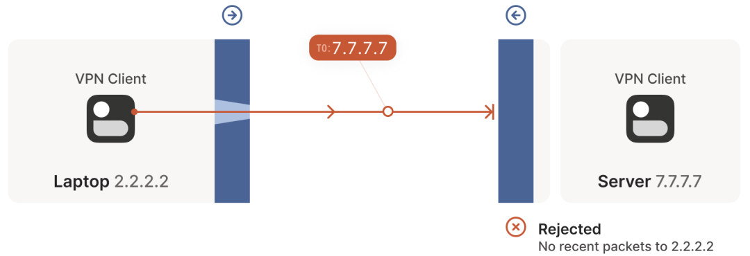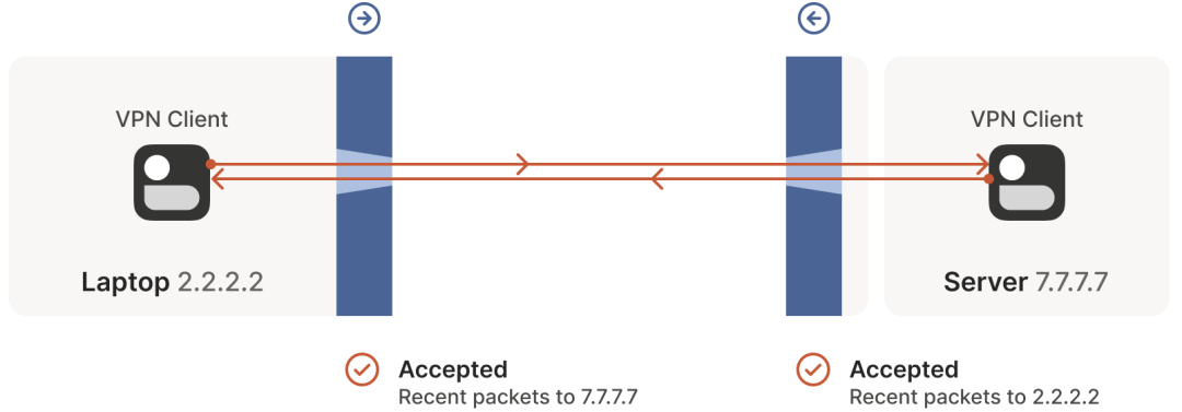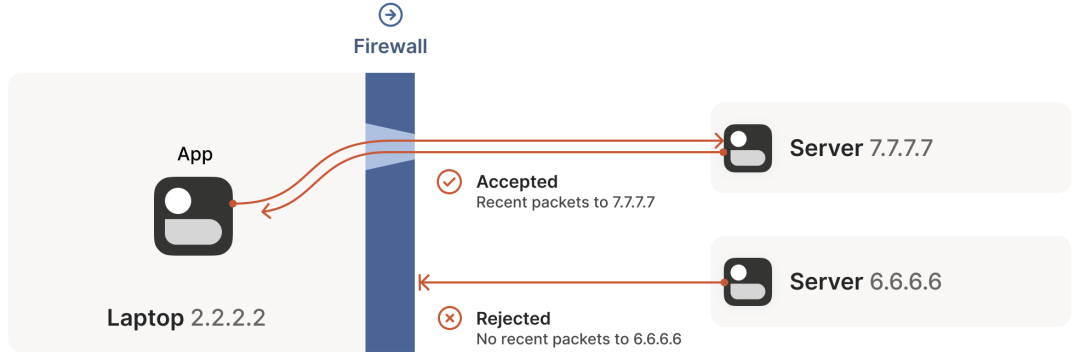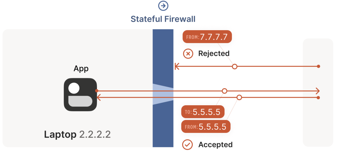 笔记本电脑中自带了一个防火墙,当该防火墙看到从这台机器出去的 2.2.2.2:1234 -> 5.5.5.5:5678 包时,就会记录一下:5.5.5.5:5678 -> 2.2.2.2:1234 入向包应该放行。这里的逻辑是:我们信任的世界(即笔记本)想主动与 5.5.5.5:5678 通信,因此应该放行(allow)其回包路径。