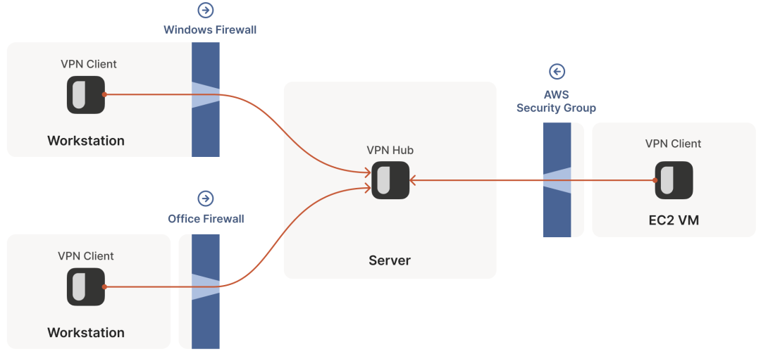 但上图是假设了通信双方中,其中一端**(服务端)是能直接访问到的**。在 VPN 场景中,这就形成了所谓的 hub-and-spoke 拓扑:中心的 hub 没有任何防火墙策略,谁都能访问到;防火墙后面的 spokes 连接到 hub。如下图所示: