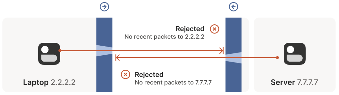 • 注意,这里除了要满足包的 IP 和端口要匹配这一条件之外,并没有要求包必须是相关的(related)。换句话说,只要某些包带着正确的源和目的地址出去了,任何看起来像是响应的包都会被防火墙放进来 —— 即使对端根本没收到你发出去的包。