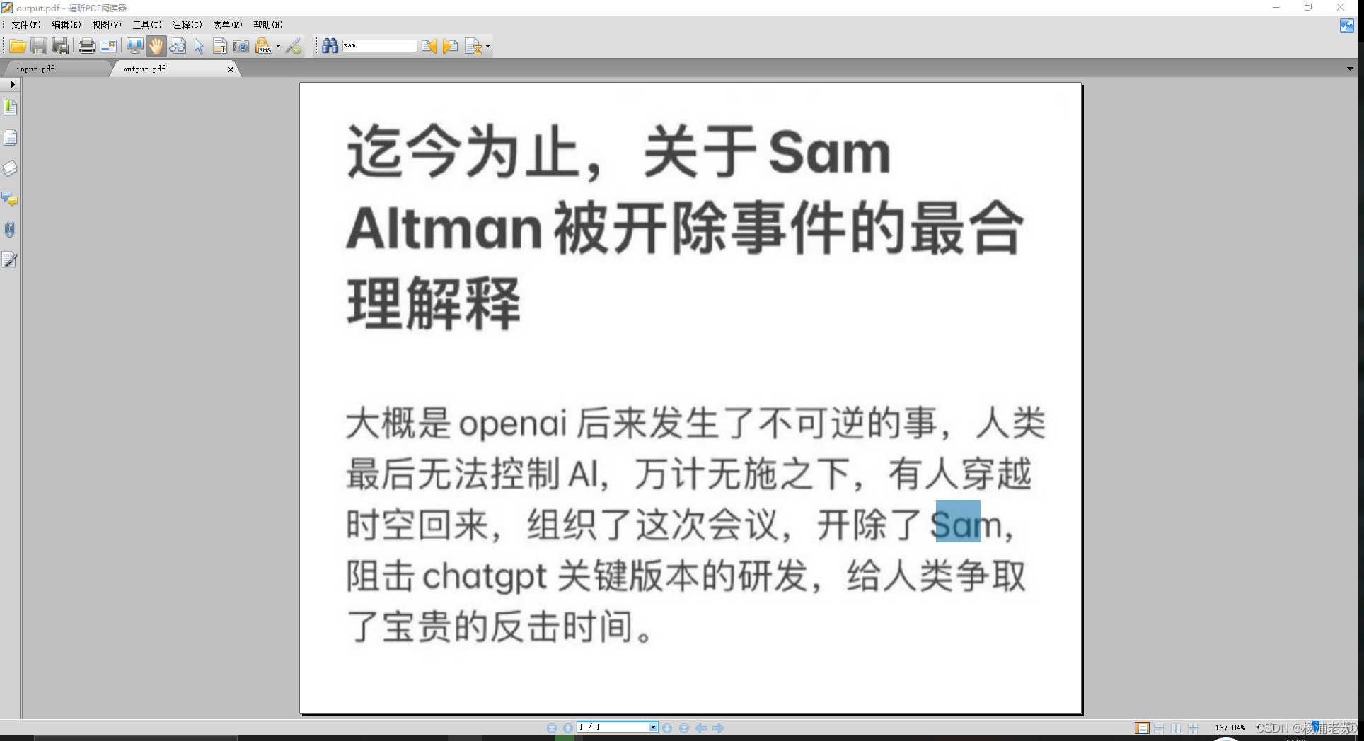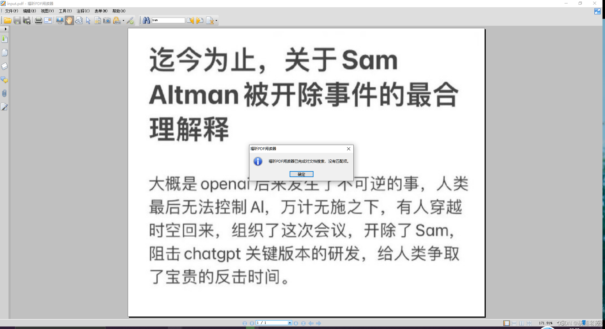 准备一个文档用于测试,这是网页上打印生成的 pdf 文件,直接搜索 sam 是没有 没有匹配项