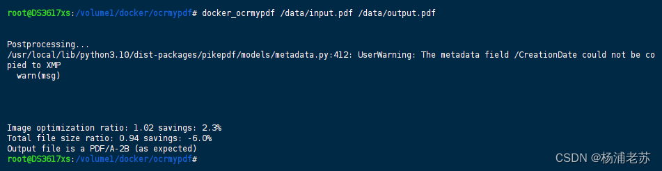 • -v "$PWD:/data":将 /volume1/docker/ocrmypdf 映射到了容器内的 /data ;