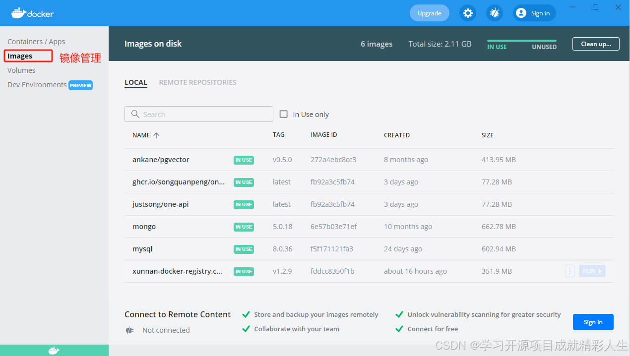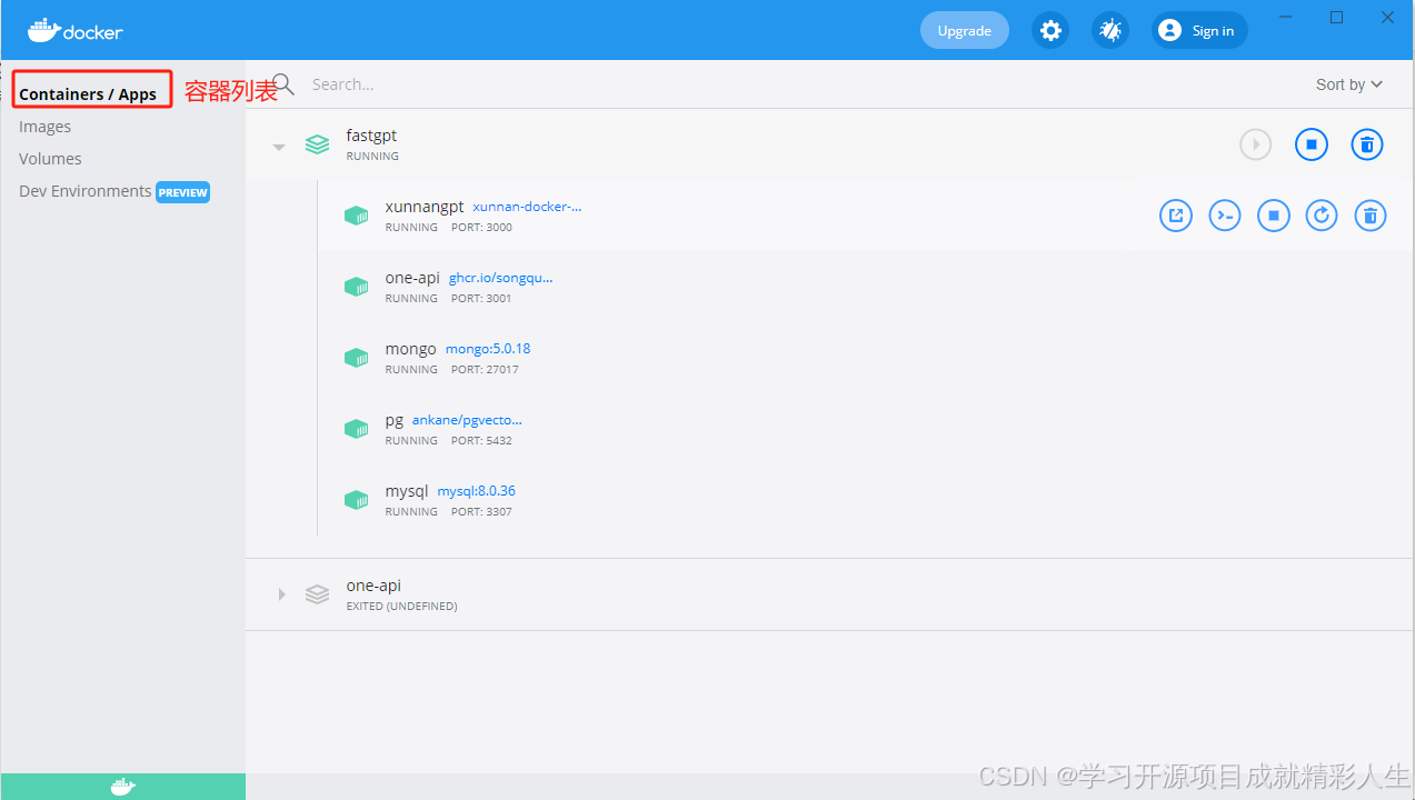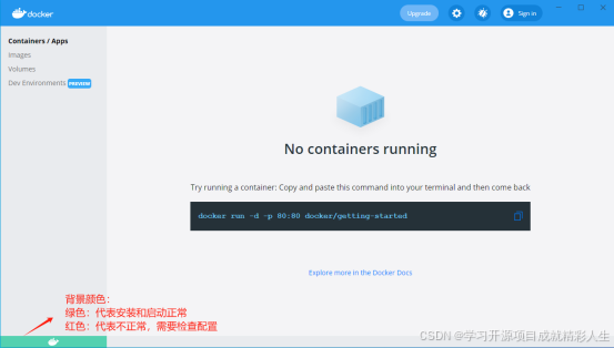 5、Docker Desktop常见问题 5.1点击运行提示WSL2安装不完整 问题描述:WSL 2 installation is incomplete. The WSL 2 Linux kernel is now installed using a separate MSl updatepackage. Please click the link and follow the instructions to install thekernel update: https://aka.ms/wsl2kernel. Press Restart after installing the Linux kernel. 问题分析:这个错误消息表明您尝试在 Windows Subsystem for Linux 2 (WSL 2) 中使用 Hyper-V 功能时,WSL 2 的安装不完整。 解决方案: 您收到的消息表明 Windows Subsystem for Linux (WSL) 2 的安装未完成。WSL 2 的 Linux 内核现在通过一个单独的 MSI 更新包安装。请点击提供的链接并按照指示安装内核更新:https://aka.ms/wsl2kernel。 在安装 Linux 内核更新后,请点击“重启”按钮。 以下是完成 WSL 2 安装的步骤: 如果您在启用 WSL 2 之前已经安装了 Linux 发行版,您需要先卸载,然后重新安装,以确保它与更新的 WSL 2 内核一起正常工作。 完成这些步骤后,您的 WSL 2 安装应该就完成了,您应该可以直接从 Windows 使用 Linux 应用程序。 5.2 怎样将 WSL 2 设置为默认版本 问题描述:windows10怎样将 WSL 2 设置为默认版本 问题分析: WSL 2(Windows Subsystem for Linux 2)是在 Windows 10 中的一个功能,它允许用户在 Windows 操作系统上运行 Linux 发行版。WSL 2 是 WSL 的第二个版本,相较于之前的 WSL 1,它具有更好的性能和更强大的功能。 WSL 2 主要用途包括但不限于以下几个方面: 开发环境: 开发人员可以在 Windows 上使用 WSL 2 来运行 Linux 工具、命令和应用程序,而无需在系统上安装虚拟机或双重启动。这使得在 Windows 上进行 Web 开发、软件开发和系统管理变得更加便捷。 跨平台开发: WSL 2 可以帮助开发人员在 Windows 上进行跨平台开发。他们可以在 Windows 中运行的 Linux 发行版中测试他们的应用程序,以确保其在 Linux 上的运行正常。 云开发和部署: 许多云服务提供商支持基于 Linux 的服务器环境。WSL 2 可以帮助开发人员在本地开发和测试他们的应用程序,并轻松地将其部署到云端 Linux 服务器上。 学习和教育: 对于想要学习 Linux 操作系统的人来说,WSL 2 提供了一个在 Windows 上安全、方便的环境。他们可以在 Windows 中运行 Linux 命令、学习 Linux 基础知识,并尝试各种 Linux 软件和工具,而无需离开 Windows 操作系统。 总的来说,WSL 2 提供了一个在 Windows 操作系统上运行 Linux 的强大工具,使得开发、测试和学习 Linux 环境变得更加容易和便捷。 解决方案:开始 PowerShell