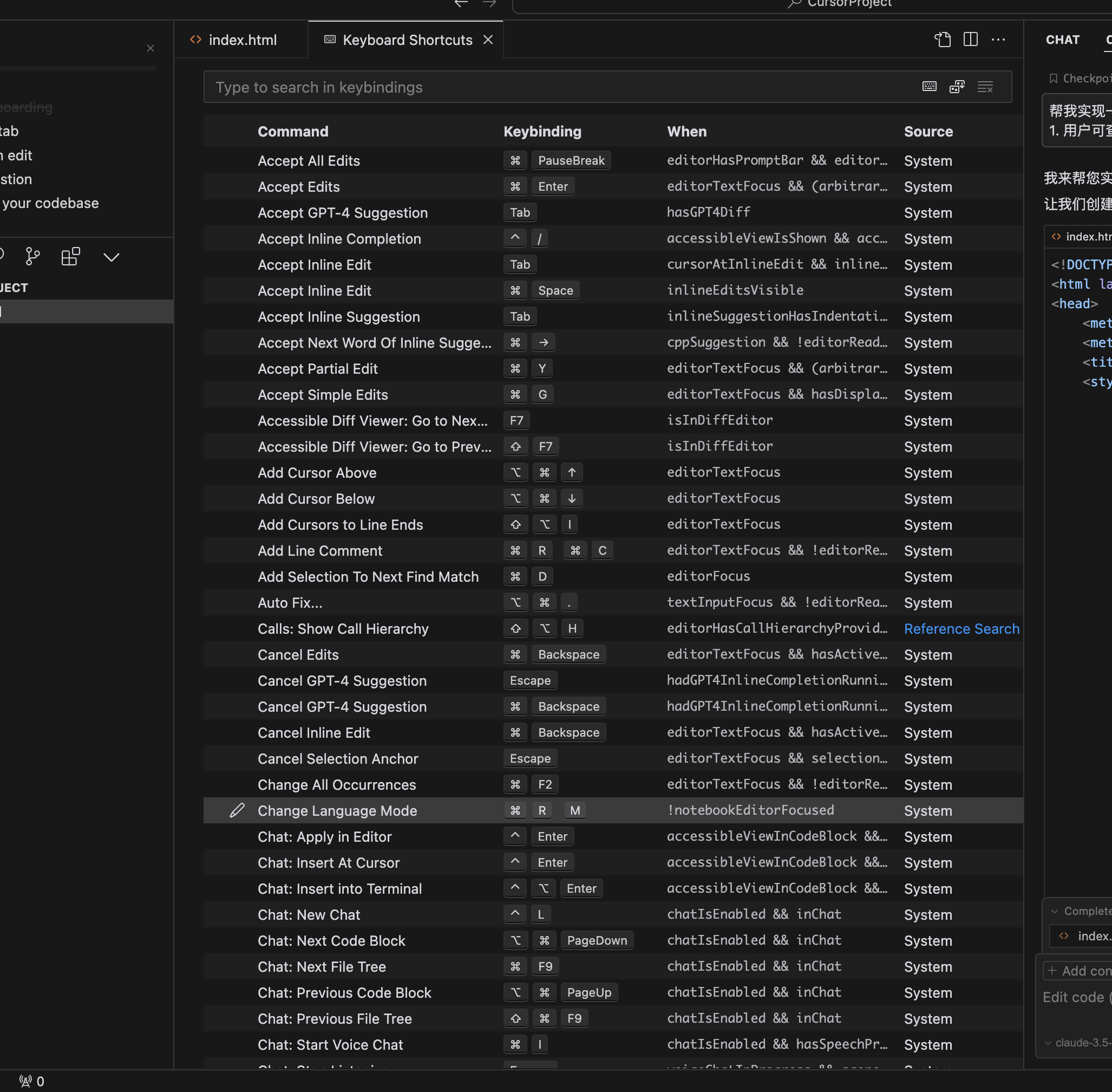 Cursor还有一些快捷键的功能,可以自行打开设置里的