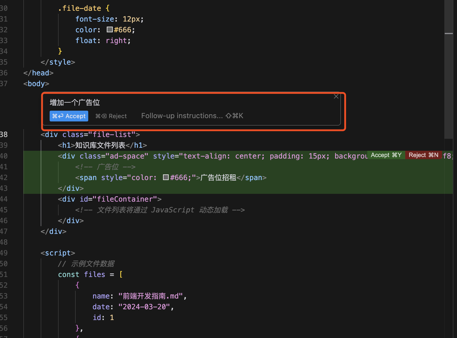 3.2 新增/修改代码、文字如果只想修改部分代码,可以鼠标选中后,使用 不选中代码的情况下,打开窗口,可以要求AI实现新增的功能,比如这里我想增加一个广告位,效果如下: