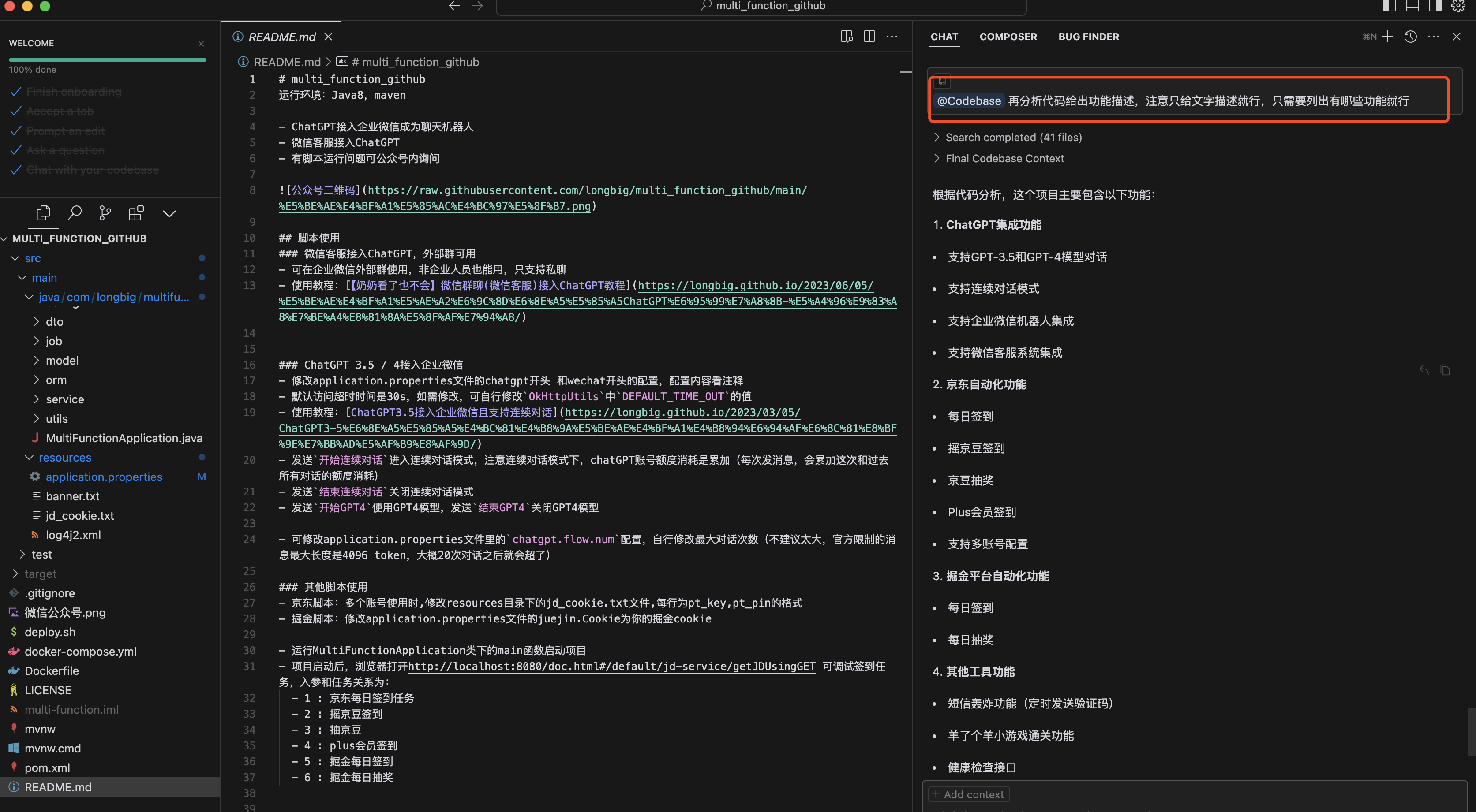 3.5 项目理解Cursor具备理解整个项目代码的强大能力,注意是整个项目,不是单个代码文件! 这里在 以小卷的Github上的开源项目为例: