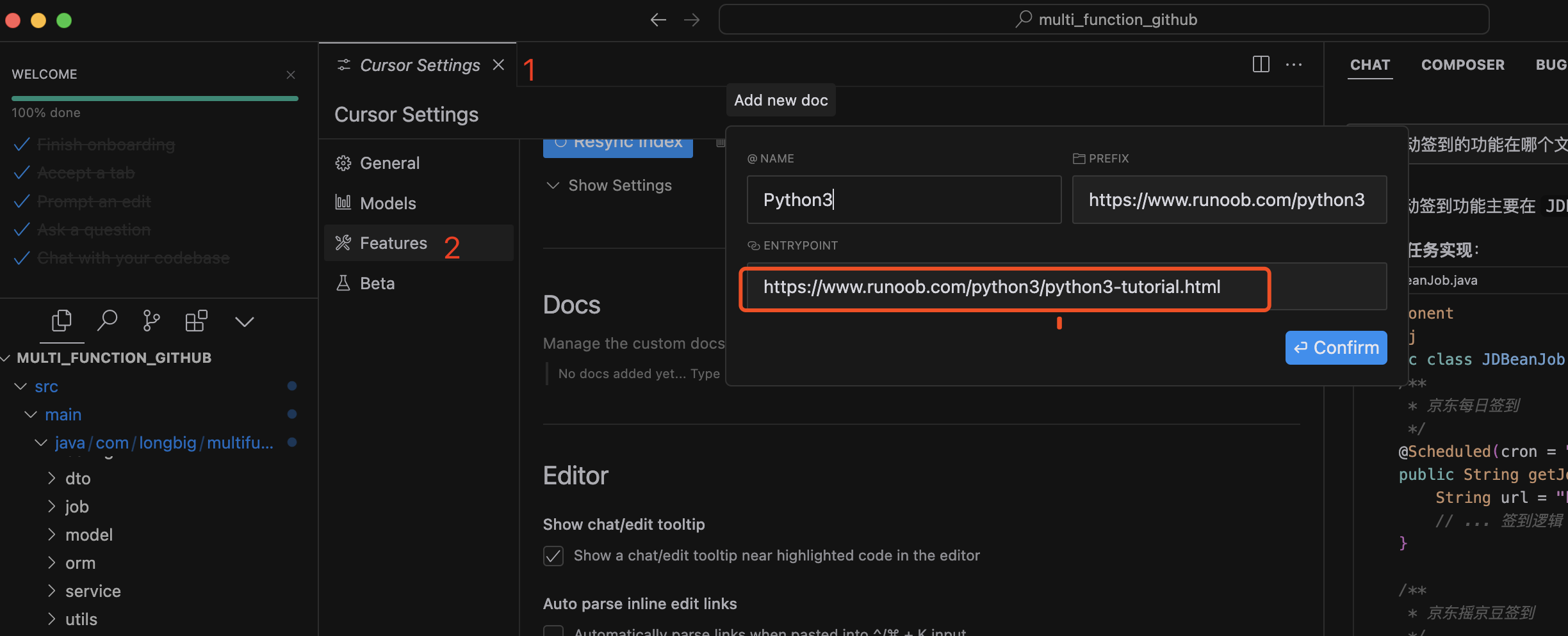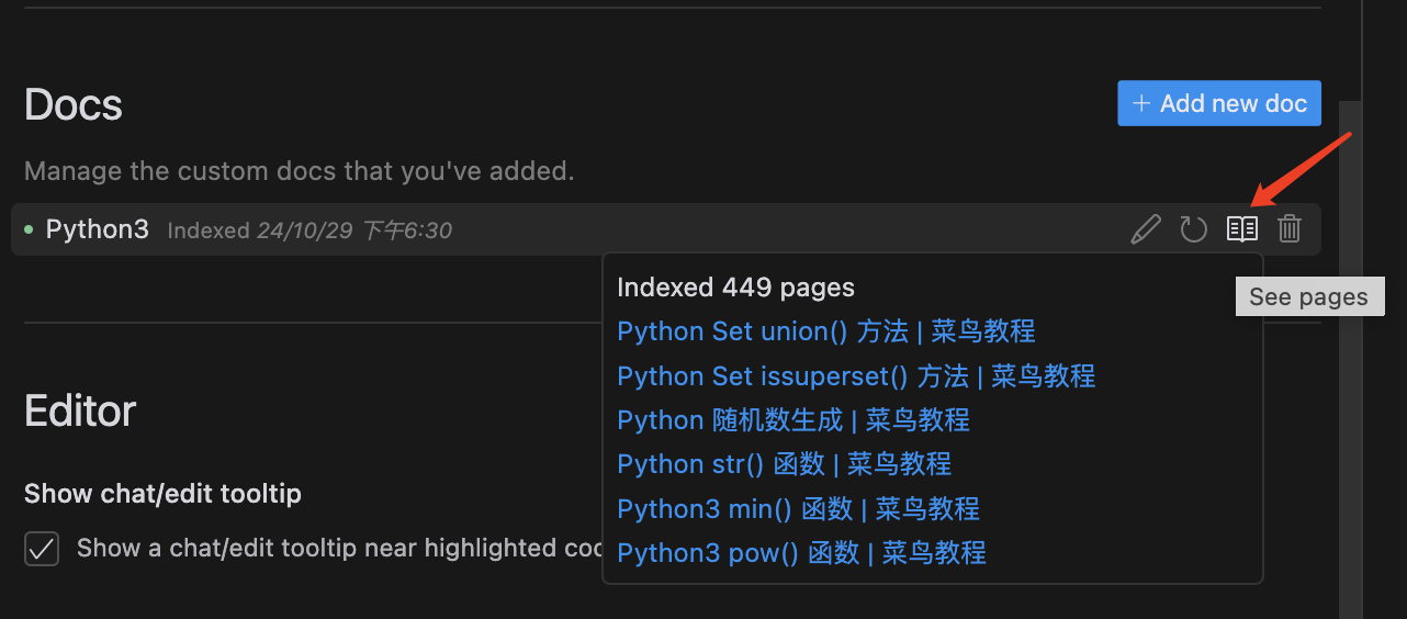 静态网页爬取成功率较高,非静态网页爬取较难,可以完全爬不了!!! 操作方法:在Setting > Cursor Setting > Features设置里,在Docs位置进行配置