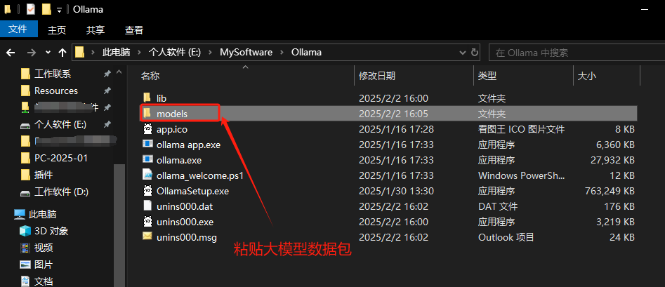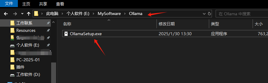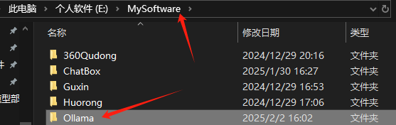首先在你想安装的路径下创建好一个新文件夹,并把Ollama的安装包放在里面。比如我的是:E:\MySoftware\Ollama