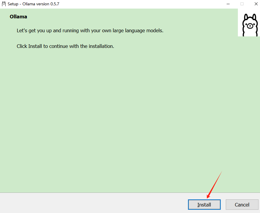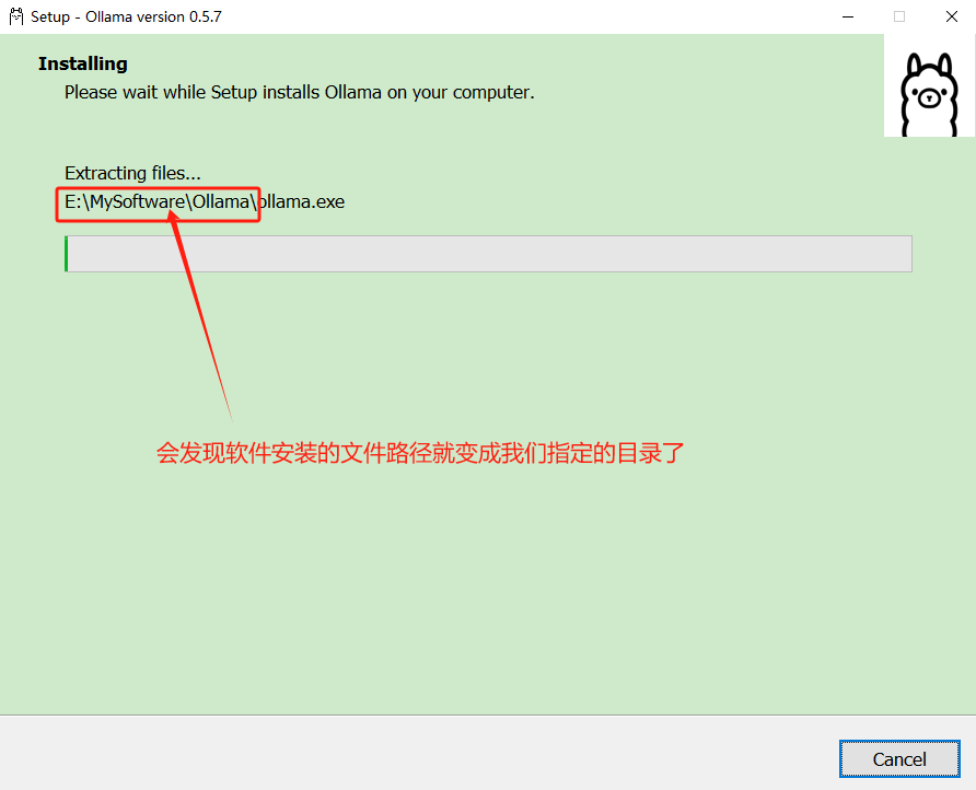 然后Ollama就会进入安装,点击Install后,可以看到Ollama的安装路径就变成了我们指定的目录了,这样大模型数据包也会默认下载在指定目录中。