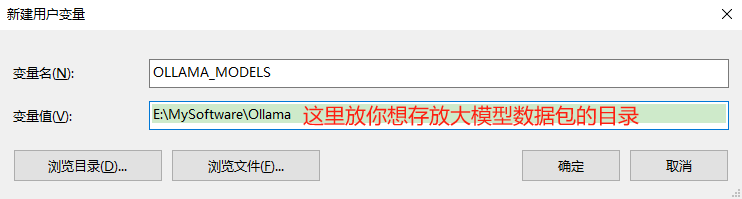 新建一个环境变量 OLLAMA_MODELS :E:\MySoftware\Ollama\models