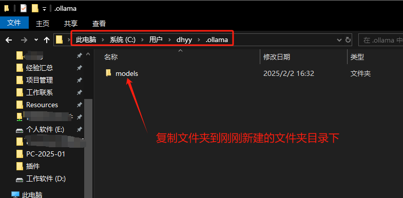 创建完环境变量后,把Ollama停止,然后进入C盘-->用户-->你自己的电脑名称-->.ollama-->复制整个models到刚刚上面新建的存储目录下。复制完成后要删除C盘目录下的models文件夹。