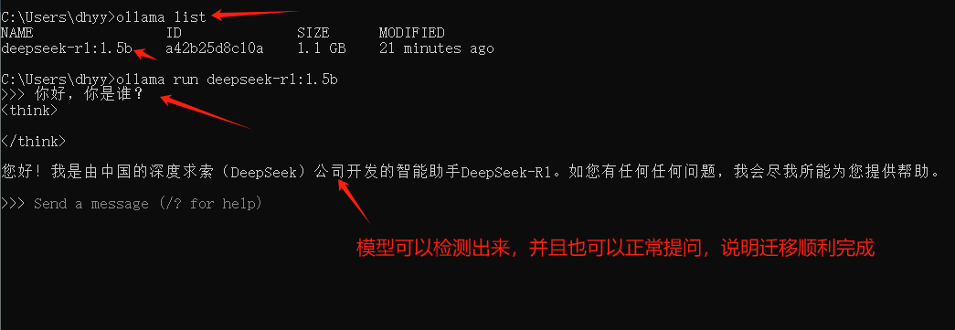 重启Ollama,打开CMD输入Ollama list,查看大模型资源包是否能正常显示,显示正常则迁移完成,也可以直接和大模型进行提问,能回复说明也正常。