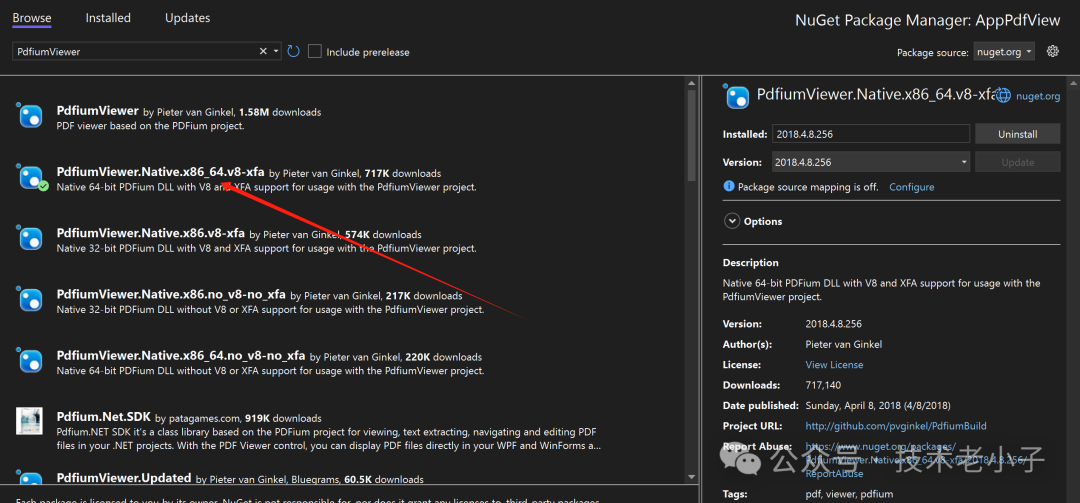 或者在 Visual Studio 的NuGet包管理器中搜索PdfiumViewer并安装。