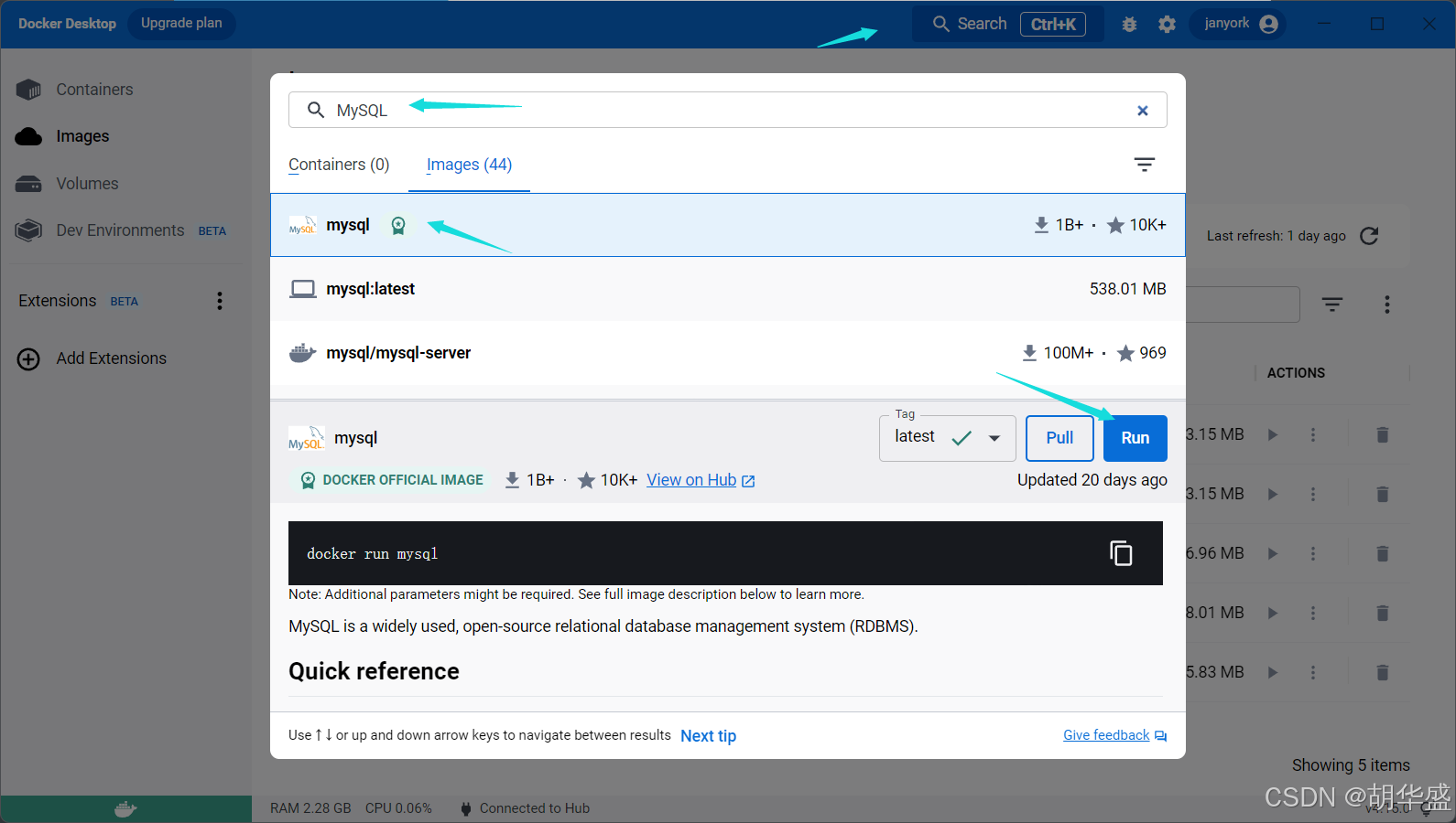 我们需要安装MySQL,我们搜索一下,第一个是官方镜像,靠谱,就用它了,我们点击RUN,PULL是下载镜像暂时不使用。