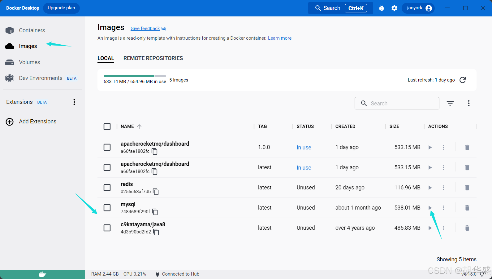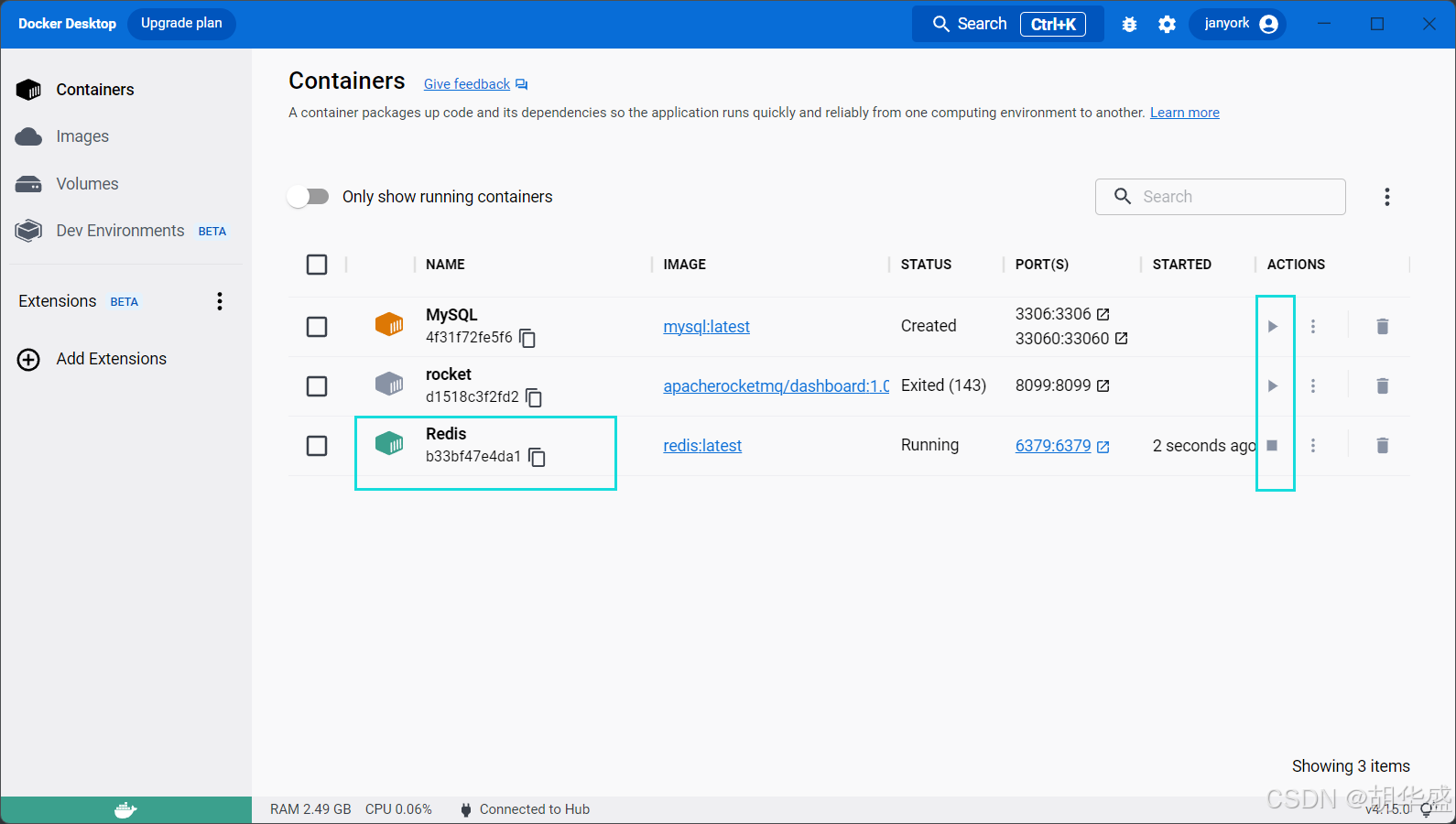 小简这里跑起来一个Redis容器,上面是MySQL和Rocket,可以看到这两个服务被我暂停了,暂停的容器下一次允许只需要点击启动,不需要重新去RUN或者去镜像那里启动,Redis刚刚跑起来,还在运行。