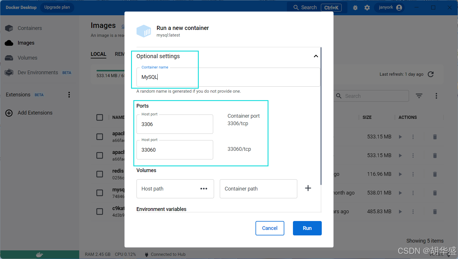 我们点击启动运行,它会弹出一个框,先给这个服务(容器)取一个名字,然后端口可以自己指定,不熟悉操作就和他右边的一样就可以,我这里和他右边一样。