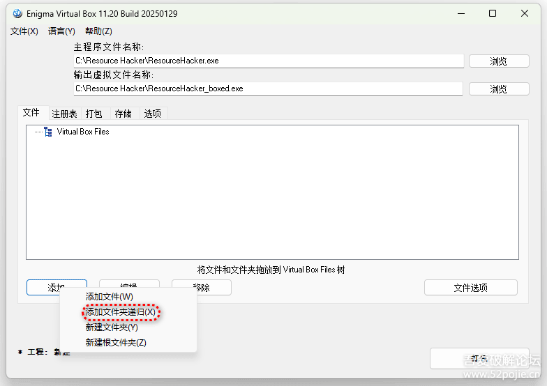 2. 点击左下角的“添加”,选择“增加文件夹递归”,选择要制作成单文件版的绿色程序文件夹,如 C:\Resource Hacker\文件夹,然后就会出现一个弹窗,要你选择虚拟文件夹目录,一般选择默认的就可以