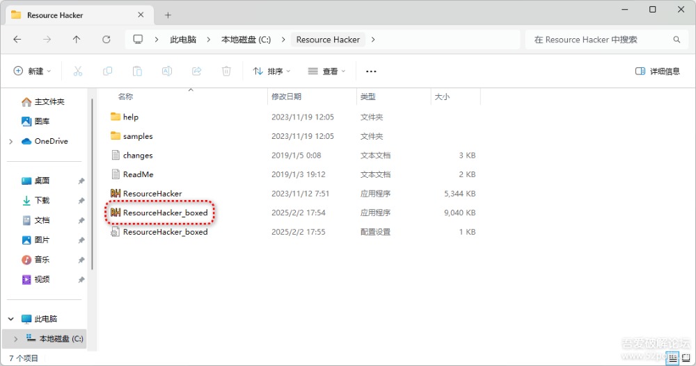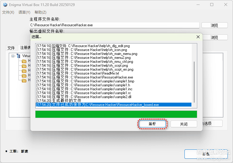 5. 点击“打包”,打包完毕后,制作出来的单文件程序ResourceHacker_boxed.exe默认会和ResourceHacker.exe在相同的目录,可点击“运行”测试打包好的单文件程序