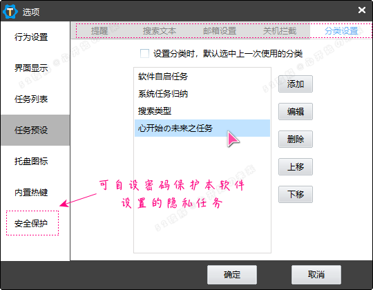 左上角可新建、按快捷键 Ctrl + Shift + O 可设置禁用自动更新、开机自启、热键、DIY主界面行为等等。双击某个任务可任意修改编辑,右键可呼出任务分类、转复合任务等选项。托盘图标可快速设置消息提醒、定时关机重启等便捷任务。左上角可新建简单或复合任务,总之怎么设置怎么来。