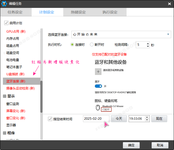 2. 触发条件:系统资源占用(CPU、GPU、内存、网速)、系统状态(连接蓝牙 / U盘、空闲时间、开机/休眠等)。另有定时、条件触发、热键触发等触发方式。