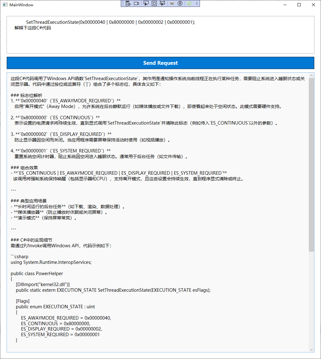 调用示例 private async void SendButton_Click(object sender, RoutedEventArgs e) { string requestText = RequestTextBox.Text; if (!string.IsNullOrWhiteSpace(requestText)) { try { string responseData = await DeepSeekHelper.CallDeepSeekAPI(requestText); // await new DeepSeekApi().CallDeepSeekAPI(chatRequest); ResponseTextBox.Text = responseData; } catch (Exception ex) { ResponseTextBox.Text = $"Error: {ex.Message}"; } } else { MessageBox.Show("Please enter a request."); } }