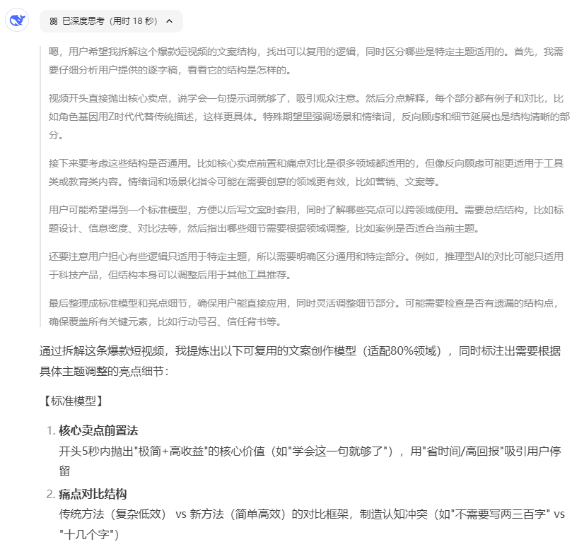 前两天,我刚建的视频号,出了个小爆款。靠着DeepSeek的热点,0投放,完成了单条视频百万播放、近8万转发、直接带来1.6万粉丝增长。一个礼拜前,我刚刚下载了剪辑软件,还用不明白操作。春节几天,新号变黄V,惊喜完成起号。那为啥要写这个文章?不是我在得瑟,而是爆了之后,太多新朋友、老朋友来问我:你到底咋搞的?教教我?这,我实在没法一个个去回复,不如就专门做一篇拆解。再有人问我,就直接发文章给他吧~这个拆解,我准备做个有趣的形式:我自己先用我的短视频公式来拆解、然后再让DeepSeek也来分析一下,这条视频的成功因素、以及可复制的爆款结构。除了爆款结构的拆解之外,我也会分享一下,这个视频的全文字稿,以及我用DeepSeek拆短视频,所用到的提示词。如果对你做内容,有些启发,或者找到了可以借鉴的点,可以点个赞、来个转发~其实整个视频的文案结构,我都是按照我自己研究的短视频公式来写的。这个公式我一直在用,也帮不少IP拿到了结果。这次我自己第一次开视频号,也算是在热点的加持下,佐证了一波这个模型的有效性。我先上模型👇知识IP爆款口播短视频:(标签文案+吸睛文案)+牵制文案+(观点文案+论证文案+金句文案)+结尾文案+指令文案我自己是研究公式的,所以我写短视频文案,也是用公式把这8个文案结构,做成表头。把「写内容」变成了「填内容」,而不是像写随笔一样,想到哪写到哪。