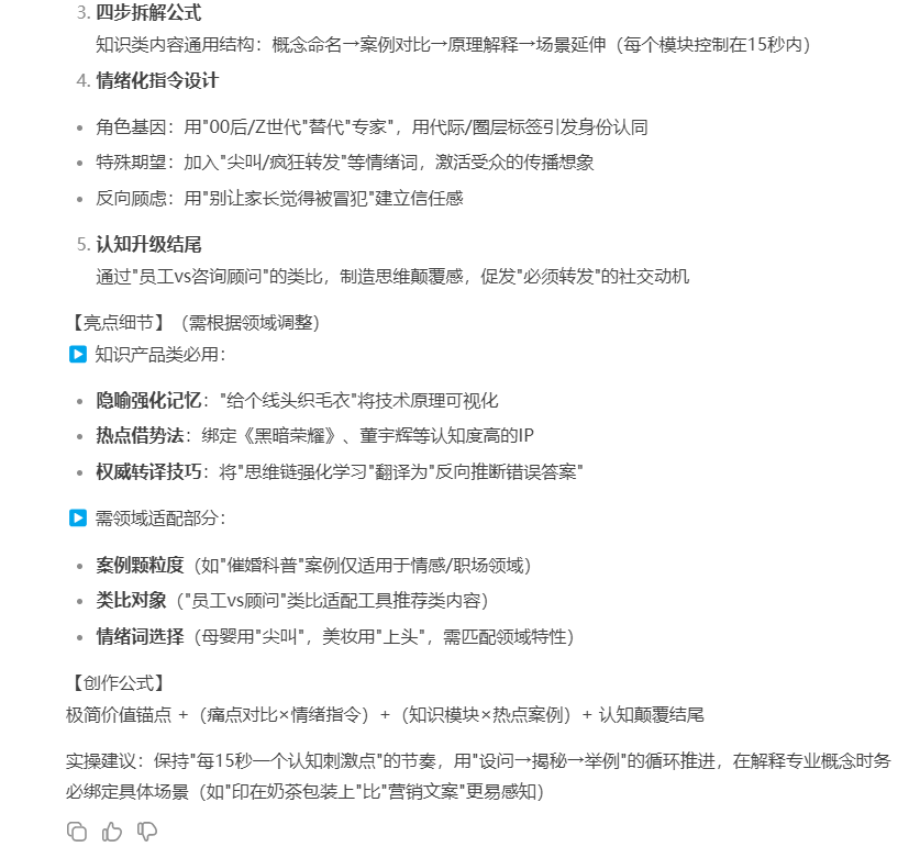 观点文案:这个提示词就是:角色基因+特殊期望+反向顾虑+细节延展(①展示结构,让用户知道有1234个词,如果对主题感兴趣,不会听个20秒就划走;②直接给公式,满足干货感的同时,看得懂但不确认细节,想继续听;③熟悉又陌生,知道提示词要写角色、写期望,那基因是啥、特殊是啥)