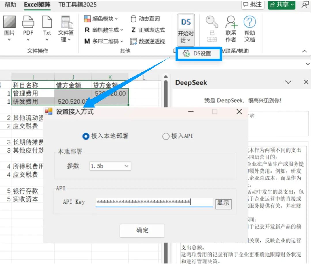 既可以通过本地部署的DeepSeek接入Excel,也可以通过Api key访问DeepSeek接入Excel。