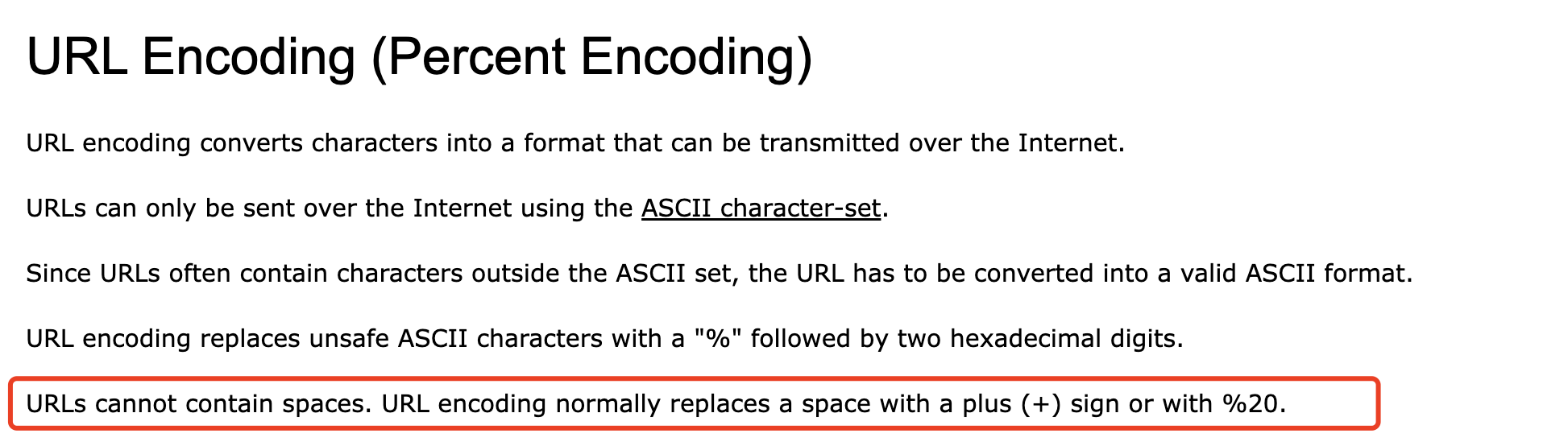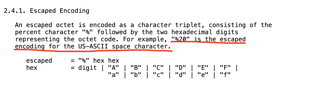 在RFC3986中提到:除了 数字 、 字母 、-_.~ 不会被转义,其他字符都会被以百分号(%)后跟两位十六进制数 %{hex} 的方式进行转义。在这个规则中空格会被转为%20,而+会被转为%2B