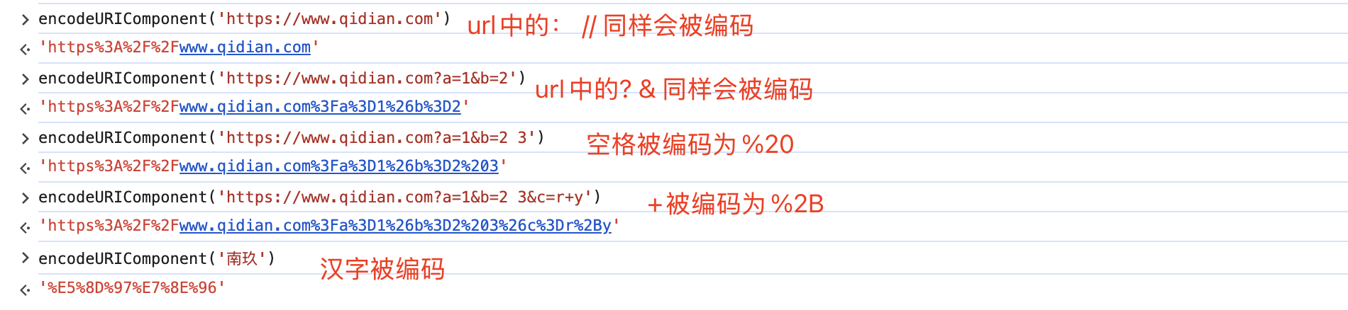 encodeURLComponent除了这些A-Z a-z 0-9 - _ . ! ~ * ' ( ) 不会被编码,其余字符都会被编码