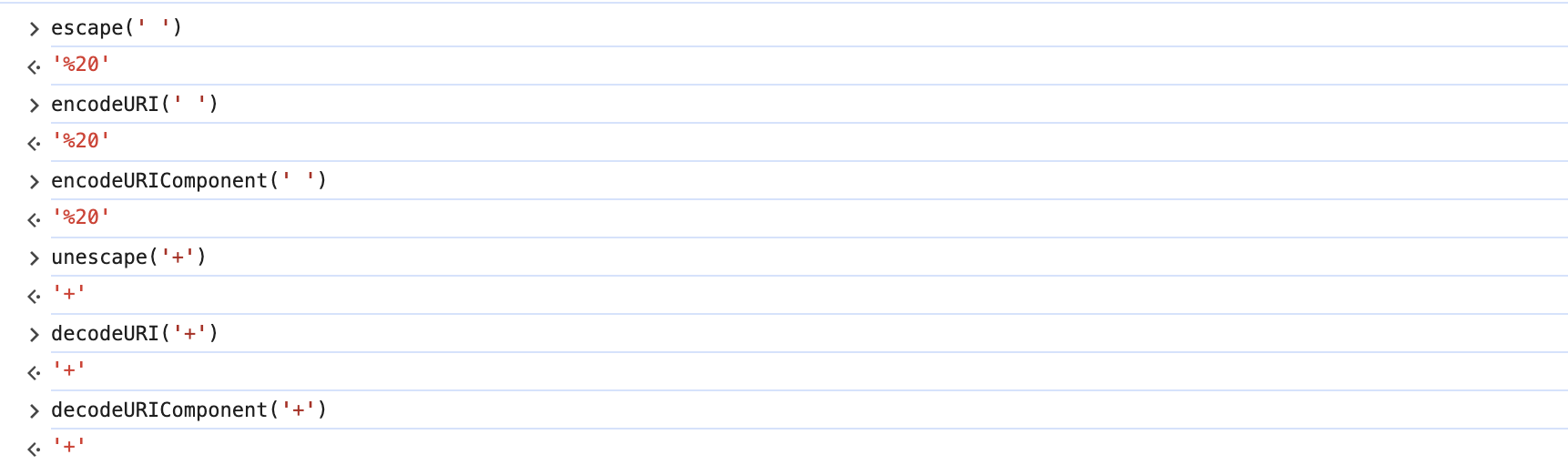 上面分别介绍了URL的编码规范,以及前端编码方法应用的规范。总结下来就是空格不会在前端产生,前端应用的编码规范不会将空格编码成+,也不会把+解码成空格。
