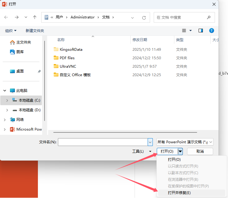如果的确是此PPT文件出问题了,可以使用 Microsoft Office 的“打开和修复”功能: