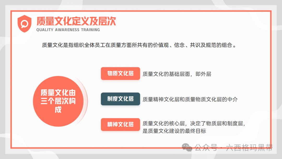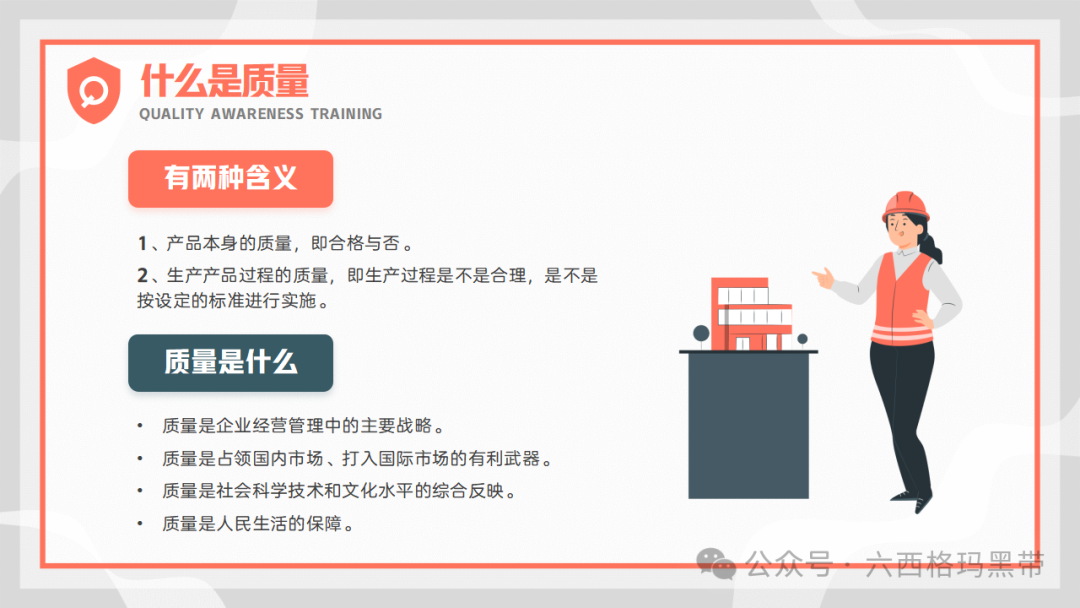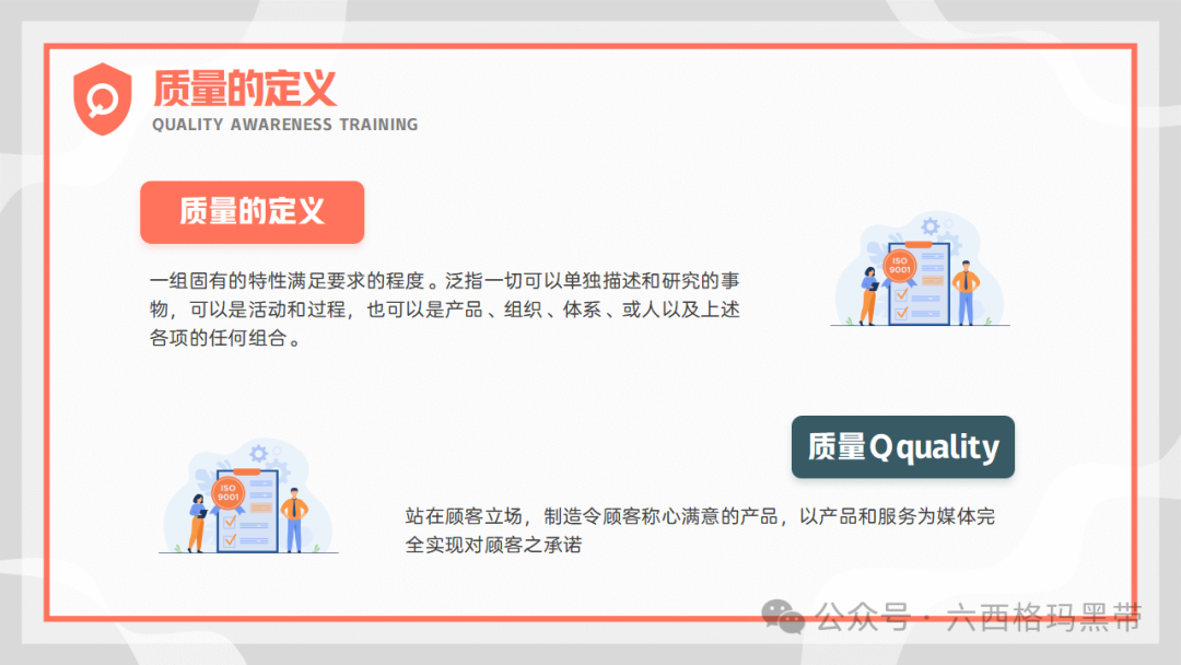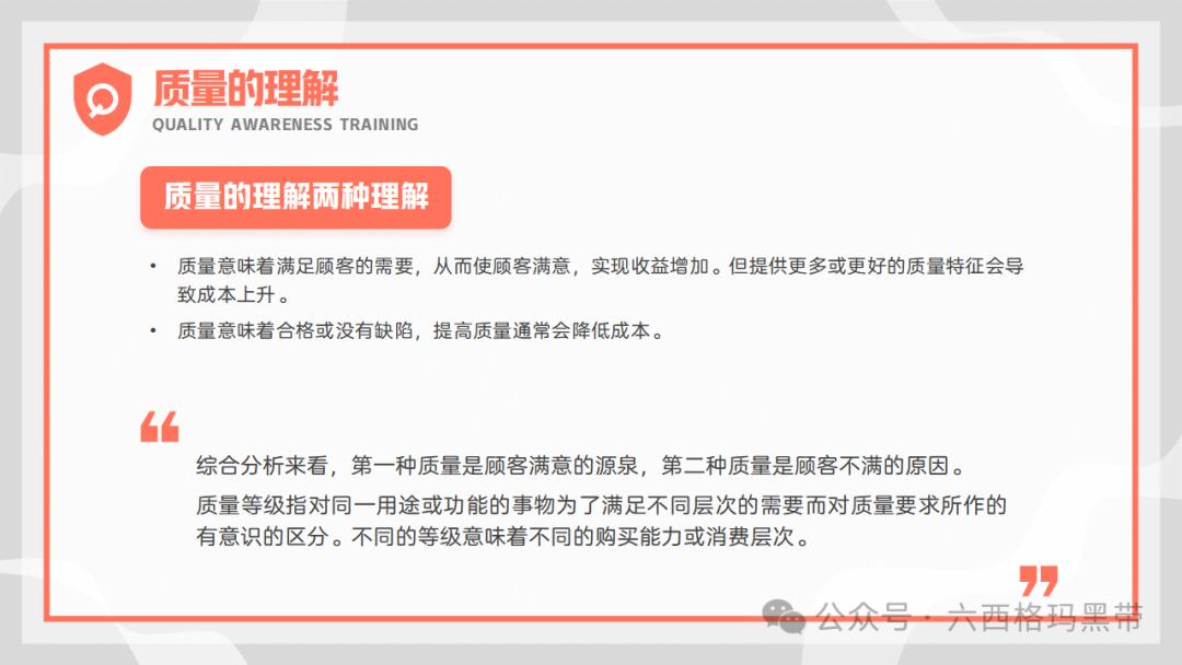 质量已成为企业持续发展和赢得客户信任的关键因素。质量意识,作为质量理念的具体体现,不仅关乎产品的优劣,更直接影响到企业的声誉、市场份额乃至生存与发展。因此,加强员工的质量意识培训,对于提升企业整体质量管理水平、促进企业文化建设具有重要意义。我们来探讨质量意识的重要性、质量的基础知识、对质量的不同理解、质量的意义以及质量的特性,旨在为员工提供全面而深入的质量管理知识,促进质量意识的提升。 质量意识的重要性质量意识是质量理念的表现形式质量意识是指员工对质量的认识、态度和价值观,它直接指导着员工在日常工作中的行为选择。一个拥有强烈质量意识的员工,会自觉地将高质量标准融入到每一项工作中,从源头上减少质量问题的发生。质量意识是企业文化的重要组成部分,它体现了企业对质量的重视程度和对顾客需求的关注。 控制质量行为质量意识能够引导员工遵循既定的质量控制流程和规范,确保每个环节都达到预定的质量标准。通过培养员工的质量意识,可以形成一种自我约束和相互监督的机制,有效降低不良品率,提升产品整体质量水平。 质量意识受客观实践活动影响和制约质量意识并非凭空产生,而是基于实际工作中的经验积累和对质量问题的深刻认识。企业通过组织质量培训、案例分析、现场指导等活动,可以帮助员工树立正确的质量观念,同时,员工在实际操作中的反馈和体验也会进一步丰富和深化其质量意识。 质量基础知识质量的定义质量是指一组固有的特性满足要求的程度。这一定义强调了质量的主观性和相对性,即质量的好坏取决于产品或服务是否满足了预定的要求或期望。这些要求可能来自顾客、法律法规、行业标准或企业内部标准等。此外,质量的概念广泛,涵盖了所有可单独描述和研究的事物,无论是有形的产品还是无形的服务,都有其质量属性。 质量的意义