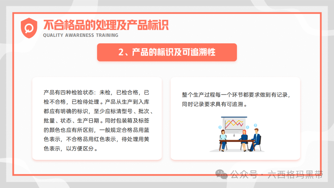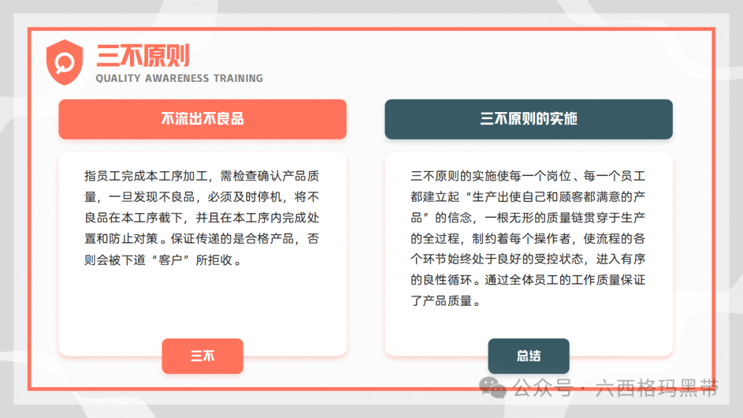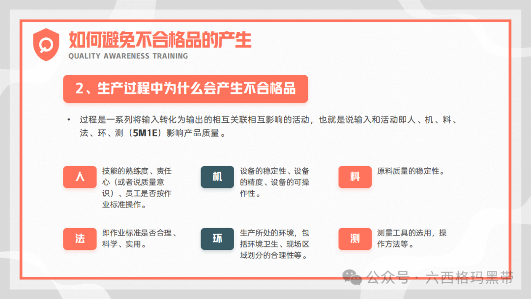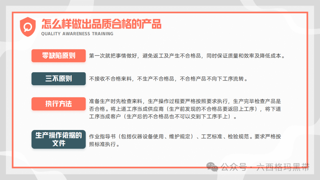 产品质量的重要性不合格品的影响产品质量是企业生存和发展的基石,不合格品的出现不仅会直接影响顾客的满意度,导致企业形象受损,还可能引发一系列连锁反应,最终造成公司亏损。不合格品会增加企业的处理成本,包括返工、报废、赔偿等费用,同时还会影响交货进度,破坏与客户的合作关系,甚至可能因违约而面临法律诉讼。因此,严格控制产品质量,避免不合格品的产生,是企业质量管理工作的重中之重。 避免不合格品的产生明确产品质量是生产出来的,不是检验出来的这一观念强调了生产过程控制的重要性。检验只是对产品质量的验证手段,而真正的质量是在生产过程中形成的。因此,企业必须重视生产过程的每一个环节,确保每个环节都符合质量标准。 控制生产过程中的六因素为了有效避免不合格品的产生,企业需要严格控制生产过程中的六大因素:人(操作人员)、机(设备)、料(原材料)、法(工艺方法)、环(环境)、测(测量)。通过加强对这些因素的监控和管理,可以及时发现并纠正潜在的质量问题,确保产品质量的稳定性。 如何做出品质合格的产品零缺陷原则和三不原则零缺陷原则零缺陷原则强调“第一次就把事情做好”,即要求员工在生产过程中严格遵守质量标准,确保每个环节都不出错。这一原则要求员工具备高度的责任心和敬业精神,以零缺陷为目标,不断提升自己的技能水平。 三不原则三不原则包括:不接收不合格来料、不生产不合格品、不合格产品不向下工序流转。这一原则要求员工在生产过程中严格把关,对不合格品进行及时拦截和处理,防止不合格品流入下一道工序或市场。 执行方法和作业依据为了确保产品质量的合格性,企业需要制定详细的执行方法和作业依据。在生产准备阶段,员工应先检查来料是否符合质量要求;在生产操作过程中,应严格按照作业指导书、工艺标准和检验规范执行;生产完毕后,应对产品进行全面的检查,确保产品合格后方可流转至下一道工序。 三不原则的实施为了有效实施三不原则,企业需要加强员工的质量意识培训,让员工明确自己的职责和义务。同时,企业还需要建立健全的质量管理制度和监督检查机制,对生产过程中的每一个环节进行严格的监控和管理。具体来说:
