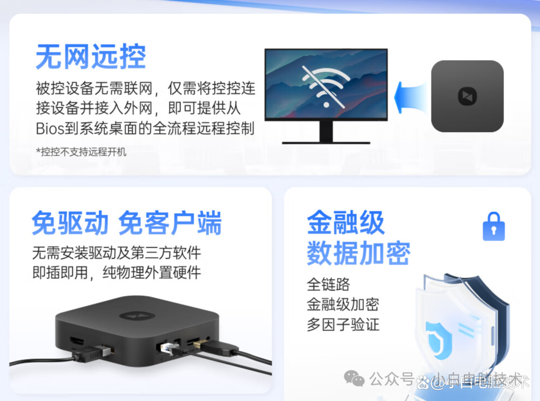 有了这个硬件,远在老家的父母再也不怕不会使用电脑了。如果是做运维的小伙伴,再也不用急急忙忙赶回公司维护服务器了,直接远程就能搞定。