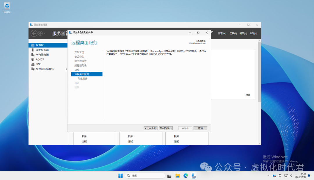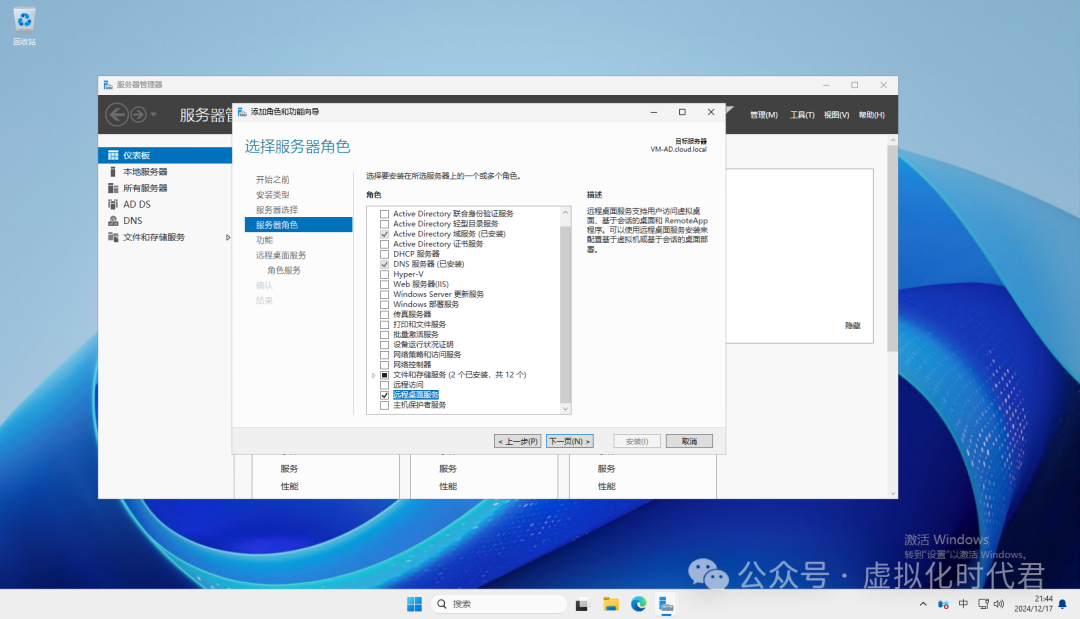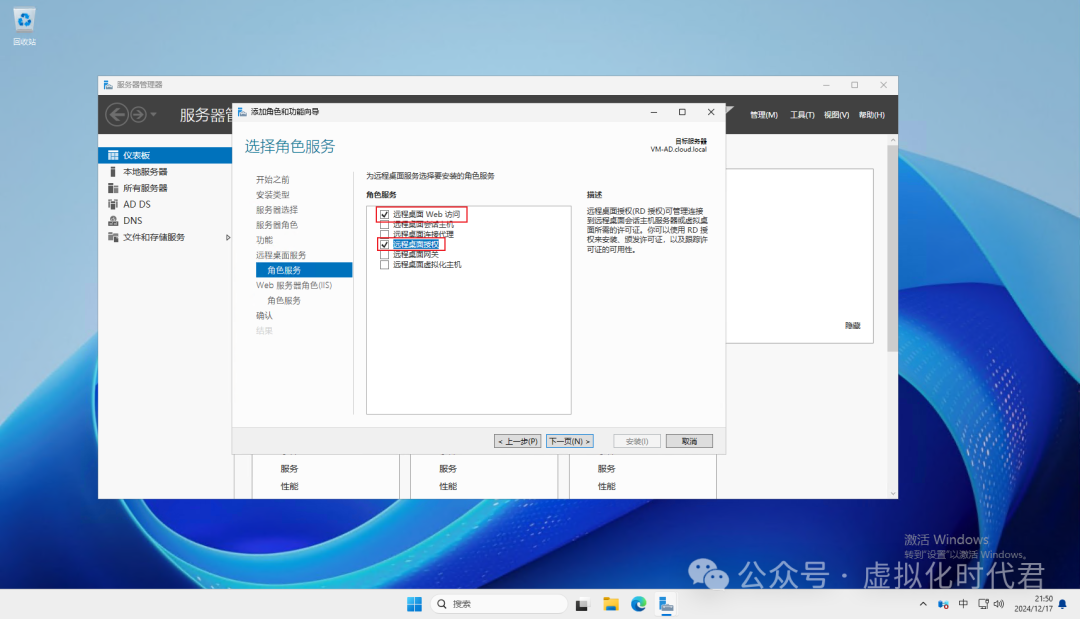 9、选择1和4,分别为远程桌面Web访问和远程桌面授权