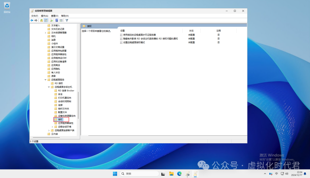 4、依次打开计算机配置->策略->管理模板->Windows组件->远程桌面授权->远程桌面会话主机->授权,如图所示