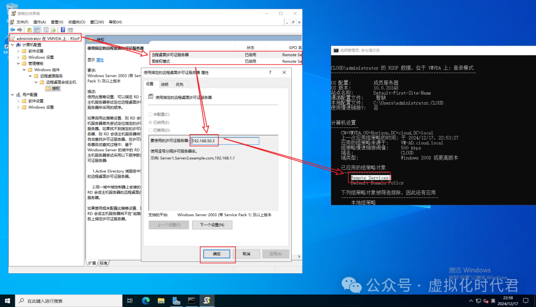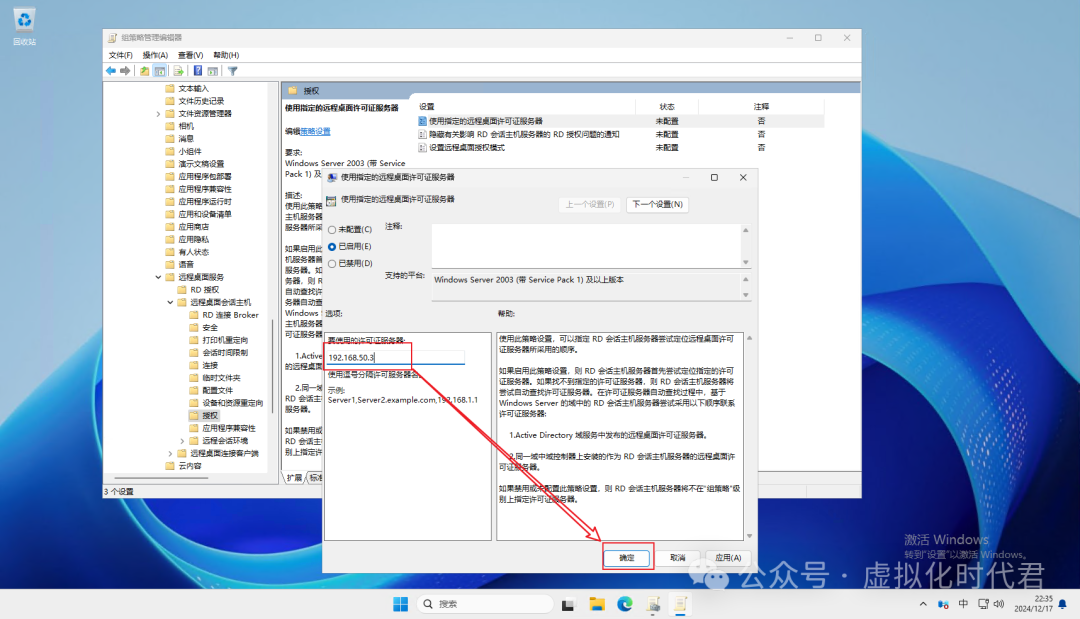 5、选择右侧:使用指定的远程桌面许可证服务器,输入我们刚才授权服务器的ip