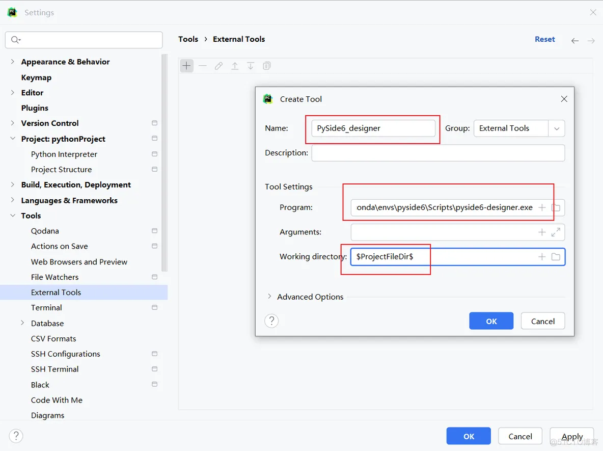 Program:C:\Users\Admin\.conda\envs\pyside6\Scripts\pyside6-designer.exe Arguments不需要 填。