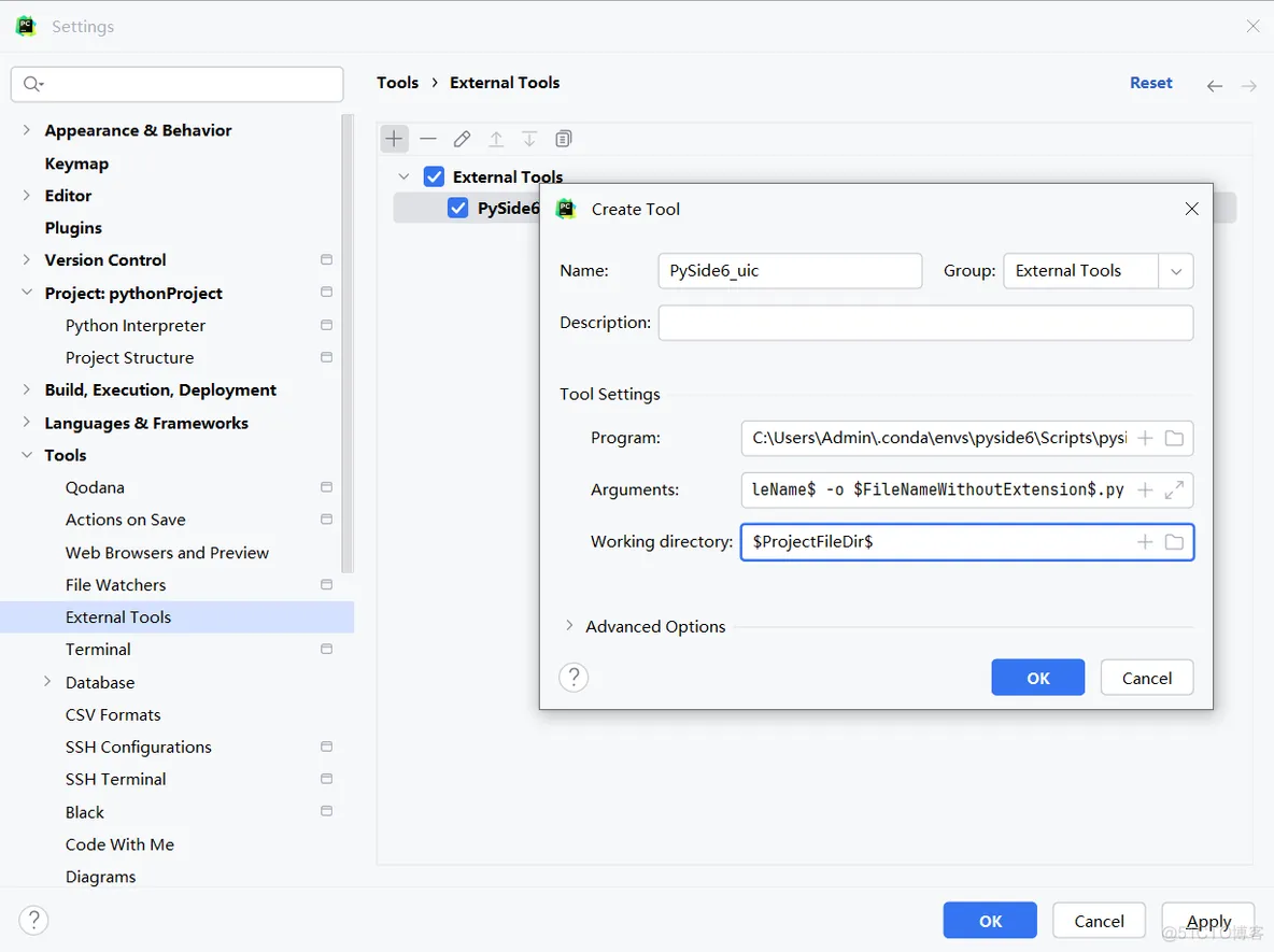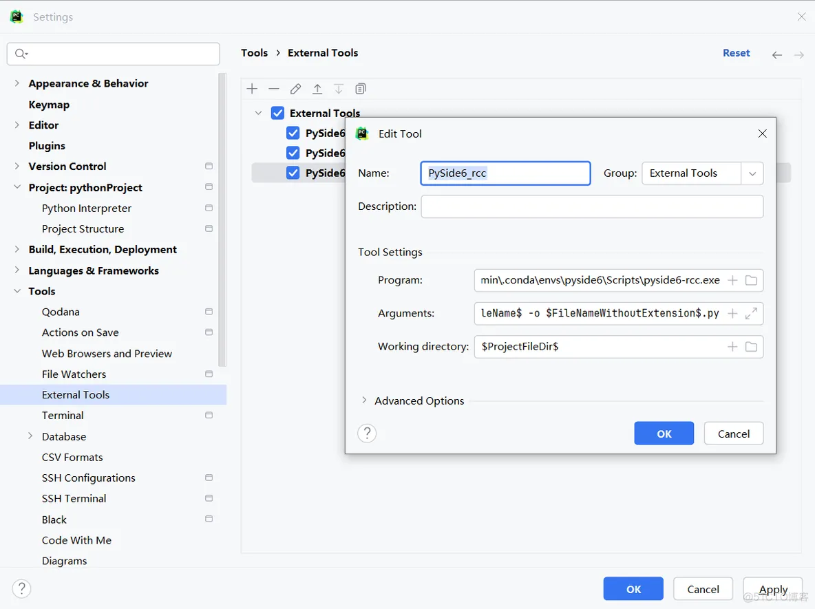 Program:C:\Users\Admin\.conda\envs\pyside6\Scripts\pyside6-rcc.exe Arguments:$FileName$ -o $FileNameWithoutExtension$.py