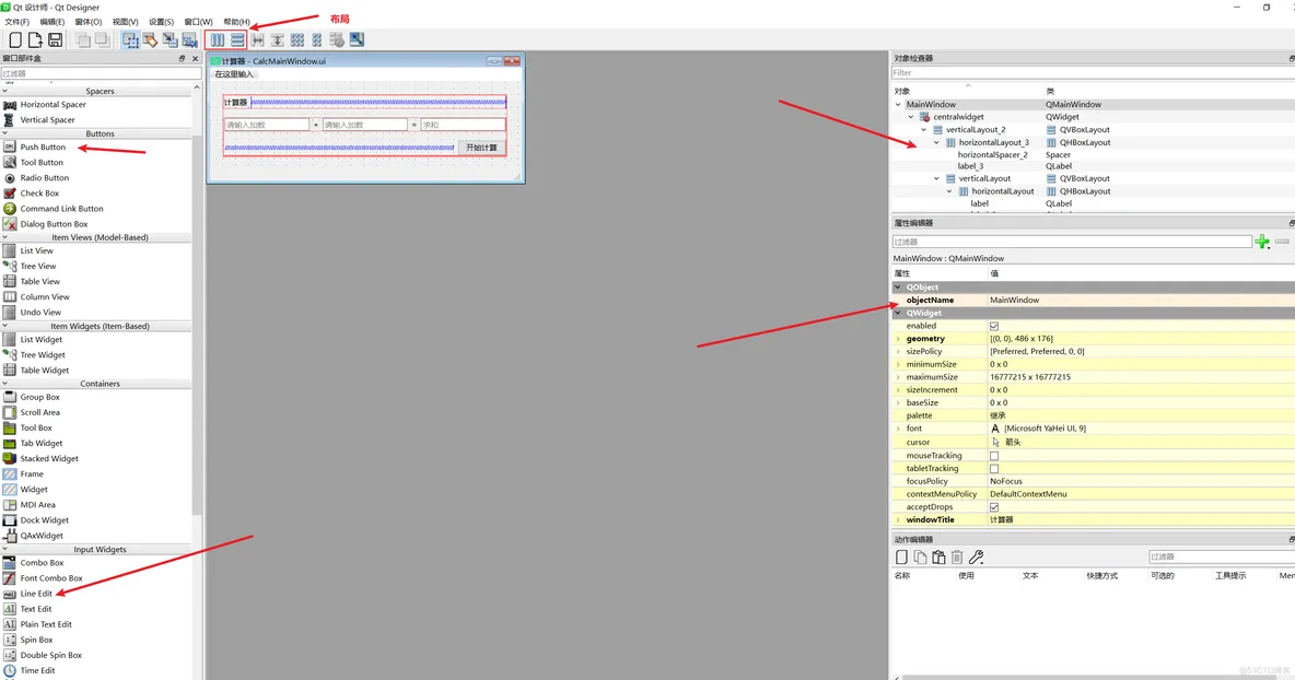 2、QLineEdit、QLabel、QPushButton(1)ui布局
