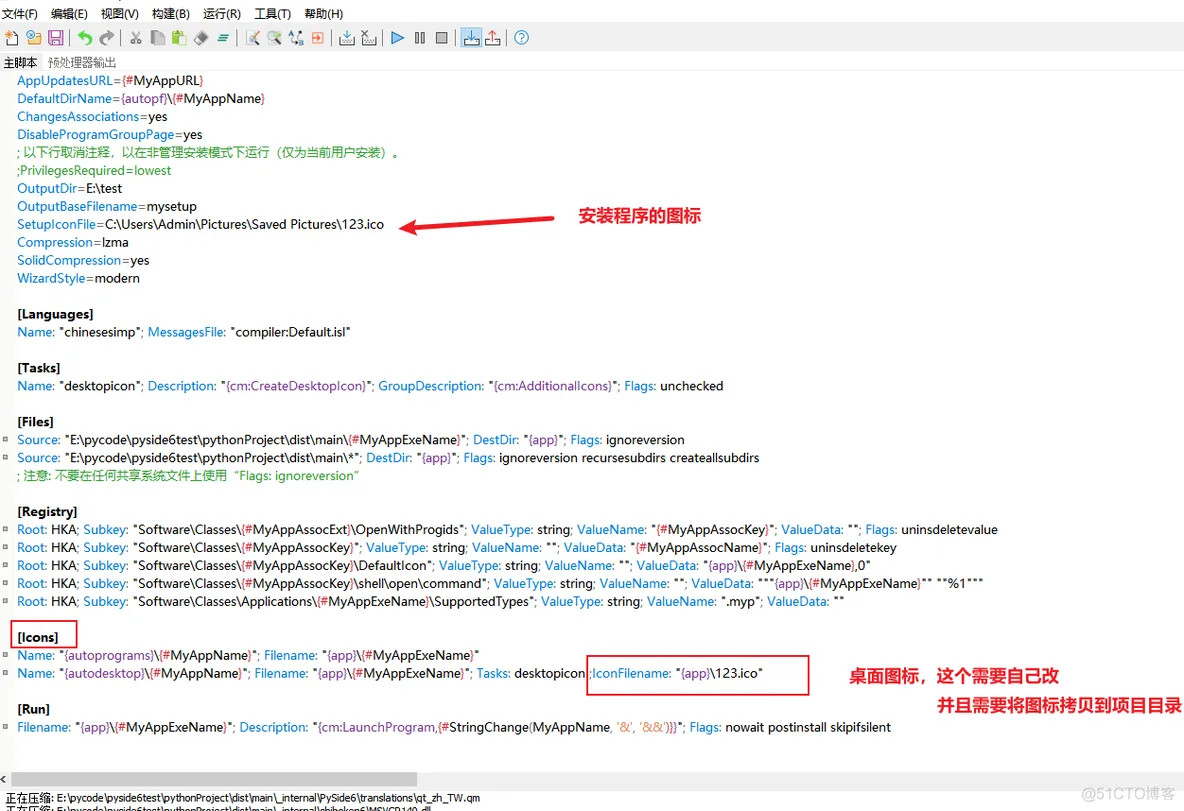(3)图标注意事项除了在打包前定义的图标之前,还需要修改脚本: