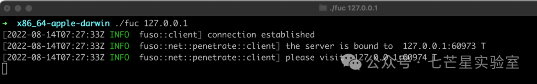 Step 3:在你需要穿透的电脑上启动fuc 如下图,则表示客户端启动成功(备注:默认情况下,将转发到127.0.0.1:80, 访问端口将随机分配)