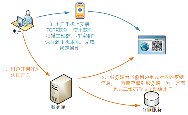 用户密钥因子是服务端为用户生成的授权密钥,计算生成验证码的时候,服务端和客户端都要使用同一个密钥进行计算,所以服务端为用户生成密钥后,除了服务端要保存该密钥与用户的绑定关系,还需要将此密钥提供给用户、由用户将其绑定到手机上的TOTP软件中(所谓绑定,本质上就是将服务端生成的密钥存储到手机的TOTP软件中)。绑定完成后,服务端和客户端就都拥有相同的用户密钥信息了。