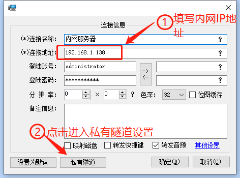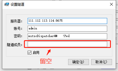 4. 在私有隧道中填写A服务器被映射的外网端口、账号、密码并勾选启用,注意在隧道成员框留空,如下图: