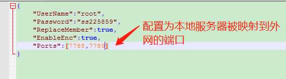 2. 打开配置文件,修改监听端口,Ports需要配置为可以被外网访问的端口,如果仅需要监听一个端口时,把Port2配置为0,在这里我们配置为7788。