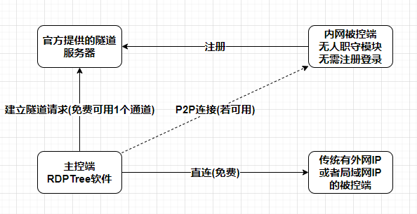 RDPTree直接封装了系统自带的远程桌面功能。一般的远程桌面软件都是通过截图的方式传输画面,而系统自带的远程桌面实际上只传输绘制操作,所以对网络带宽的要求相比其他同类软件较低,同时性能和体验会好很多,而RDPTree在这个基础上增加了内网穿透、批量控制、端口映射等比较复杂的功能,并且做了封装,同时满足了传统服务器和没有固定IP的内网PC的远程需求,更多详情可以到官网查看: http://rdptree.com/
