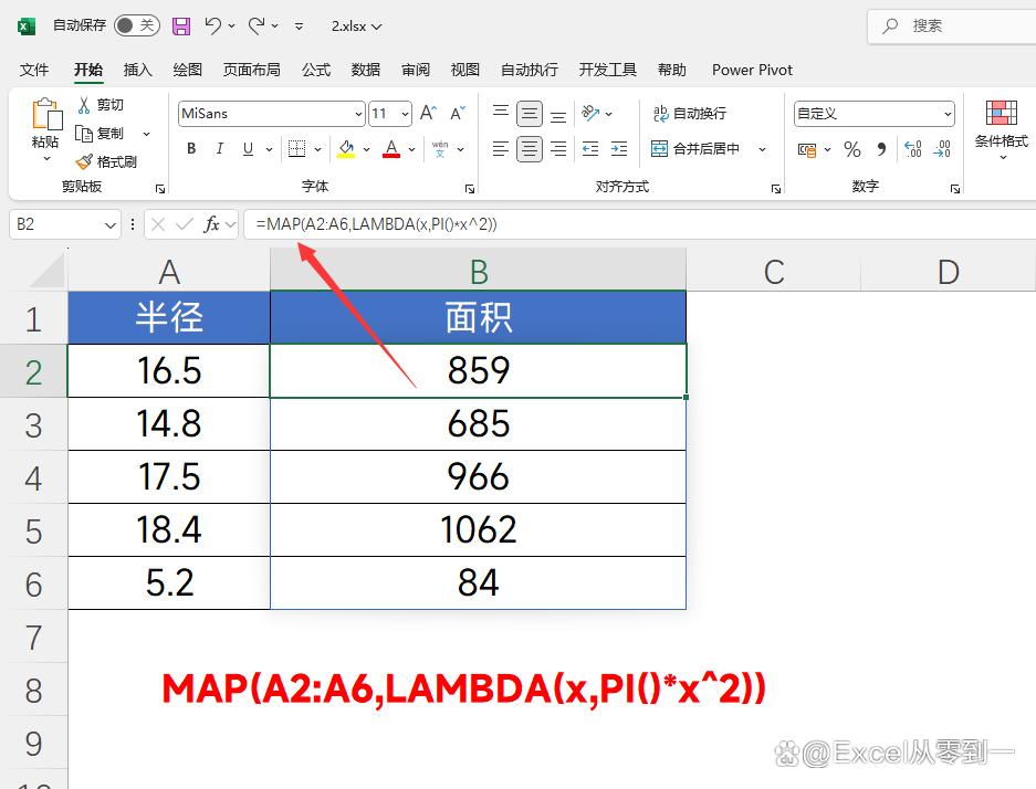 公式:=MAP(A2:A6,LAMBDA(x,PI()*x^2))
