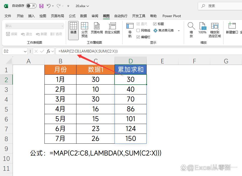 公式:=MAP(C2:C8,LAMBDA(X,SUM(C2:X)))