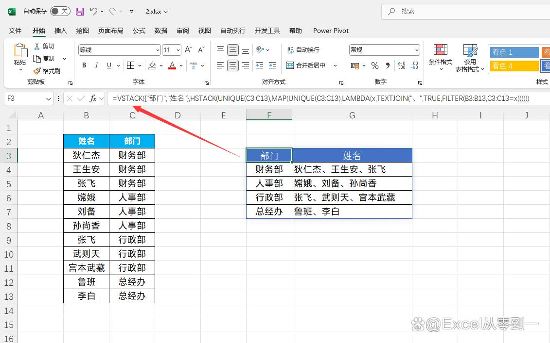 公式:=VSTACK({"部门","姓名"},HSTACK(UNIQUE(C3:C13),MAP(UNIQUE(C3:C13),LAMBDA(x,TEXTJOIN("、",TRUE,FILTER(B3:B13,C3:C13=x))))))