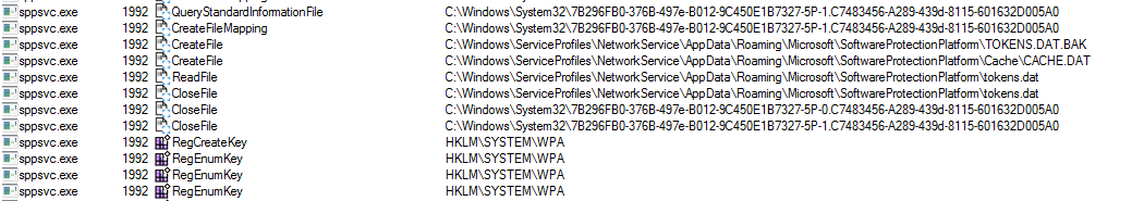 从之前的调查中,我们对第一个问题有了部分答案。使用进程监视器观察 sppsvc,我们可以准确地看到它存储激活数据的位置:
